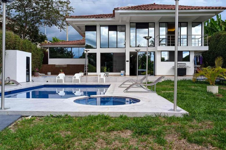 El chalet lo tiene todo, hasta una sala de cine equipada y muy cómoda, además de piscina y jacuzzy, gimnasio, estacionamientos privados para 3 vehículos, aire acondicionado en todas las habitaciones.